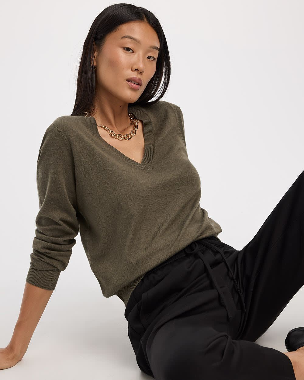 Ce pull à col en V confectionné dans un tricot ultra-doux est un incontournable à ajouter à votre garde-robe. - Tricot extensible - Fil doux - Encolure en V - Manches longues